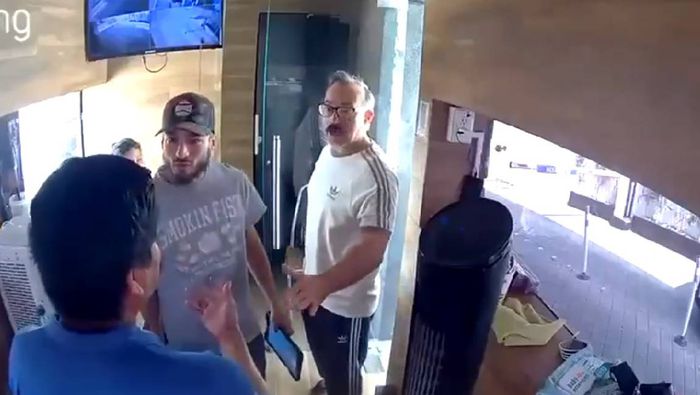 En la escena también aparece un tercer hombre, quien aparentemente intenta mediar la situación.