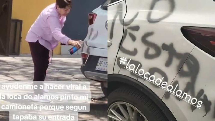En redes sociales se ha hecho viral el caso de una mujer a la que ya apodaron #LaLocaDeÁlamos, la cual es una señora que fue captada en video mientras grafiteaba una camioneta que estaba afuera de su casa.