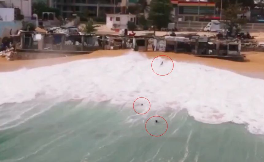 Desde la toma de arriba solo se aprecian tres punto negros en el agua, que son los turistas esperando a que los rescaten. Al final, los hechos no terminaron en desgracia ya que ante la fuerza de los océanos nadie puede.