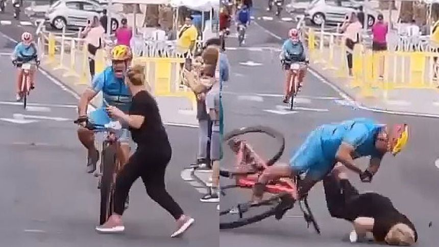 El ciclista pedaleaba a toda velocidad para asegurar la victoria, cuando varios espectadores se atravesaron en la pista, pero una mujer no logró cruzar a tiempo y terminó por impactar con el deportista que terminó perdiendo la carrera.