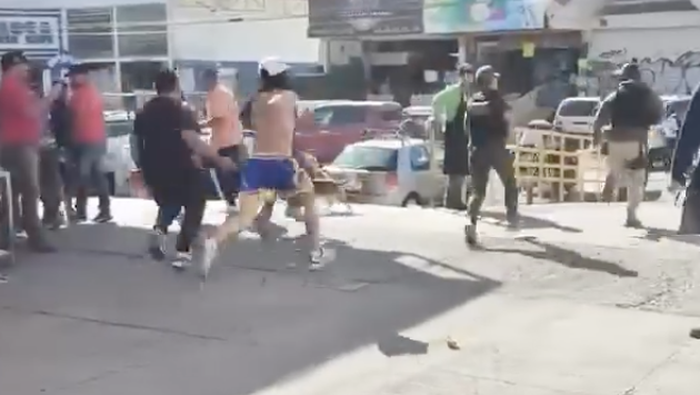 Trabajadores dedicados a cargar frutas y verduras, conocidos como “diableros”, se enfrentaron a golpes con elementos de la Guardia Civil Estatal cuando estos atendían el reporte de una riña entre los propios cargadores.