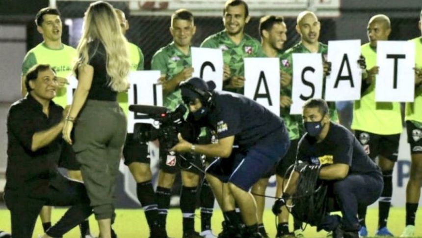Celso Ayala, estratega de 'El Kelito', pidió matrimonio a su novia en pleno campo de juego con la ayuda de los futbolistas de su equipo instantes previos al duelo.