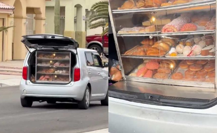 El video, que dura poco más de 30 segundos, muestra una pequeña camioneta color gris con la cajuela abierta, donde hay un pequeño mostrador con puertas transparentes que permiten ver la variedad de piezas de pan dulce a la venta.
