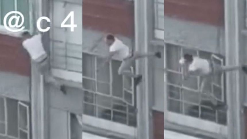 En un video que circula en redes sociales, se puede observar al hombre caminando por fuera de uno de los departamentos, mientras intenta sostenerse de los marcos de las ventanas. Desafortunadamente, no logra su cometido y cae al vacío.