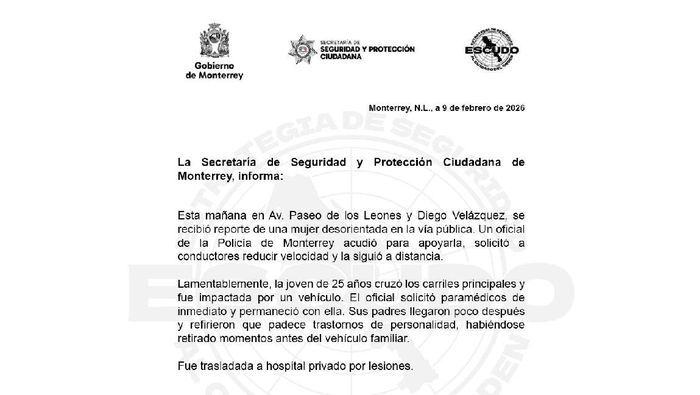 De acuerdo con reportes de la Secretaría de Seguridad y Protección Ciudadana de Monterrey, un oficial de tránsito acudió al lugar tras recibir el reporte de una mujer desorientada en la vía pública. El agente intentó auxiliarla y realizó señalamientos a los automovilistas para que redujeran la velocidad, manteniéndose a una distancia prudente.
