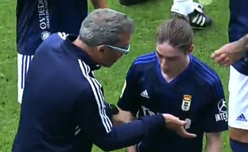 Pero fue en este momento cuando el estratega del cuadro oviedista, Jon Pérez Bolo, aprovechó para darle indicaciones de forma poco amigable al mexicano pues al explicarle lo que quería de él en la cancha lo agarró fuerte del brazo.