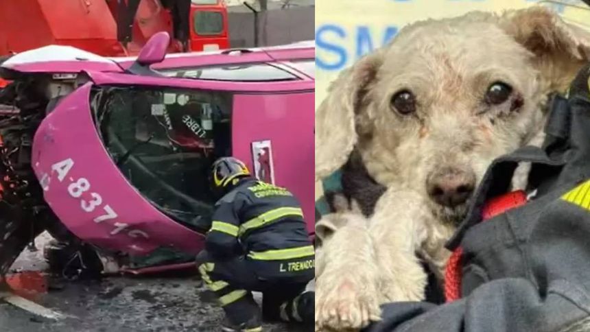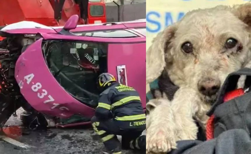 Durante las labores de rescate, los cuerpos de emergencia lograron liberar a un pequeño perro que viajaba en el taxi y había quedado prensado entre los fierros.