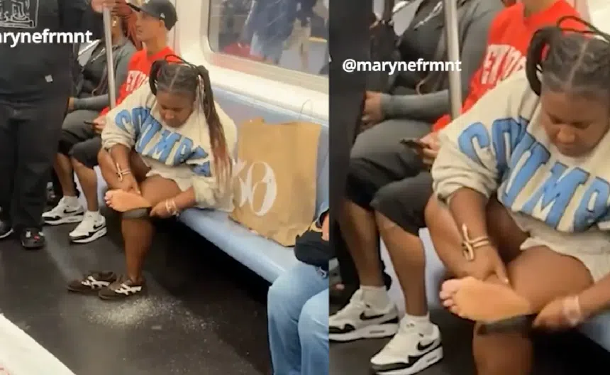 🇺🇸 | Una joven se raspa la planta del pie dejando sucio el suelo del vagón en pleno metro de Nueva York.