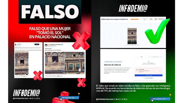 “Falso que una mujer "tomó el sol" en Palacio Nacional”, publicó la cuenta de Infodemia MX, argumentando que, de acuerdo con su análisis realizado con motores avanzados, hay indicios del uso de Inteligencia Artificial.