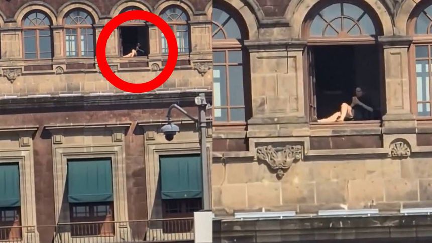 En este se escuchan motores de autos, claxones y murmullos de personas que caminan por el Zócalo, mientras la mujer, aparentemente en vestido, se asolea con las piernas descubiertas y revisa su celular desde una ventana de Palacio Nacional.