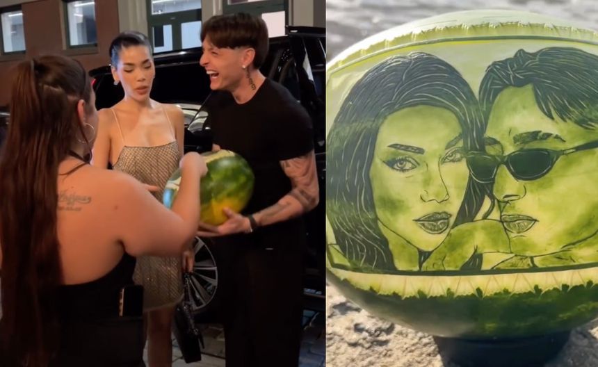 VIDEO / Peso Pluma y Kenia Os reciben el regalo más original: una sandía con sus caras
