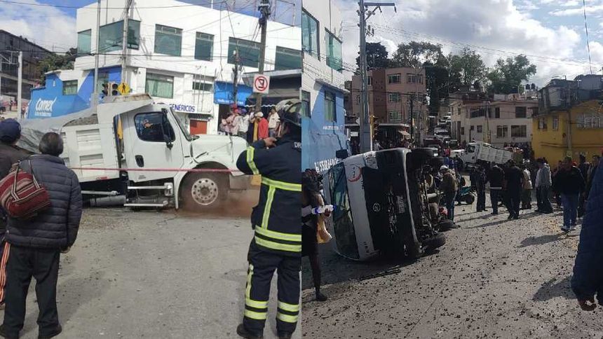 Entre los afectados también están una motocicleta y un automóvil que fueron impactados por el camión, sin embargo, fue la camioneta de pasajeros la que recibió el mayor daño, pues de acuerdo a imágenes que circulan en redes sociales, quedó volcada con todo y los pasajeros dentro.
