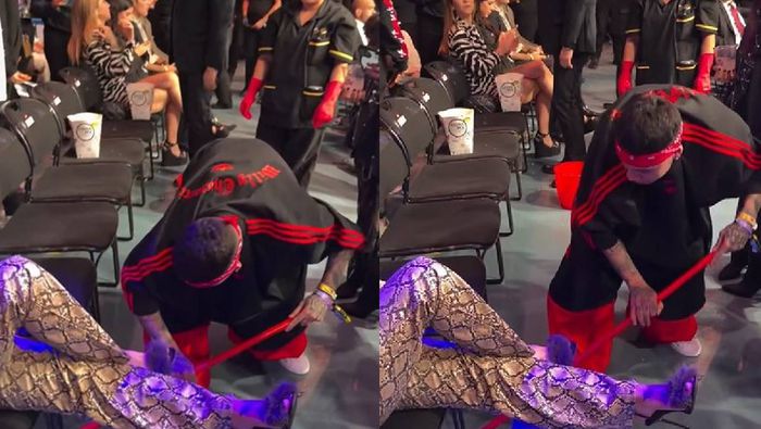Fue entonces cuando el rapero pidió el mechudo y decidió trapear él mismo la bebida que había tirado. El momento quedó grabado en video por Yordi Rosado, quien lo captó con su celular.