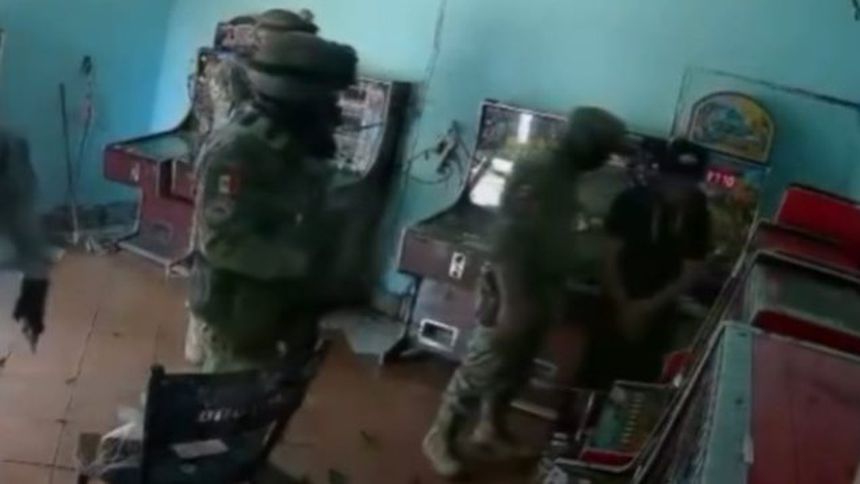 La grabación muestra a cinco hombres con equipo táctico rodeando al joven que atendía el local. Uno de ellos, con el rostro cubierto por un pañuelo, lo interroga mientras le propina golpes con la mano abierta en la cabeza y le pregunta: “¿andas halconeando?”. Antes de que el joven responda, lo toma por la cabeza y lo azota contra una de las máquinas tragamonedas.