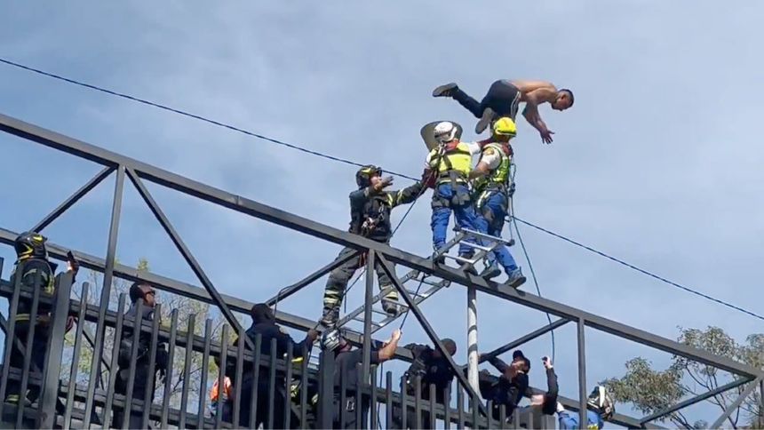 De acuerdo con un video que está circulando en redes sociales, bomberos, rescatistas y policías trataban de evitar que el sujeto sin playera se aventara al vacío, pero al final no lo consiguieron.