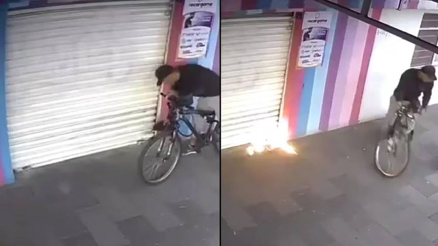 En la colonia Alfonso Ortiz Tirado de la alcaldía Iztapalapa, un hombre se acerca a un local de dulces y piñatas, saca una botella con líquido inflamable y lo esparce en la cortina. En un video que circula en redes sociales, se ve al sujeto, con gorra y sudadera oscura, encender un papel o cerillo desde su bicicleta y arrojarlo hacia la cortina.