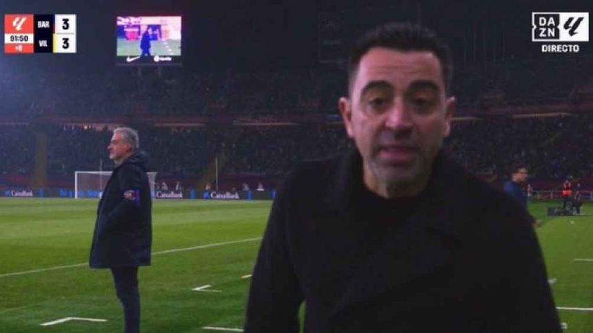 Tras la revisión del VAR, Xavi Hernández volteó a una cámara cerca del banquillo y decidió mandar un mensaje contundente en contra del arbitraje: ‘Es una vergüenza’.