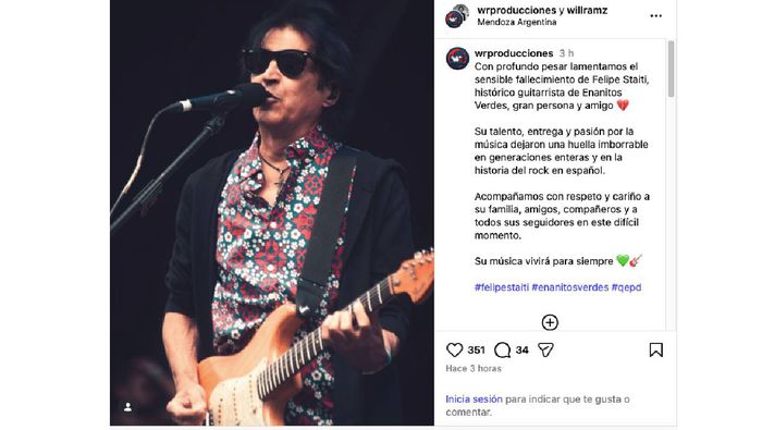 “Con profundo pesar lamentamos el sensible fallecimiento de Felipe Staiti, histórico guitarrista de Enanitos Verdes, gran persona y amigo. Su talento, entrega y pasión por la música dejaron una huella imborrable en generaciones enteras y en la historia del rock en español. Acompañamos con respeto y cariño a su familia, amigos, compañeros y a todos sus seguidores en este difícil momento.”
