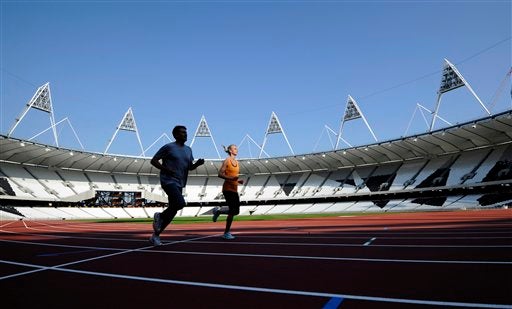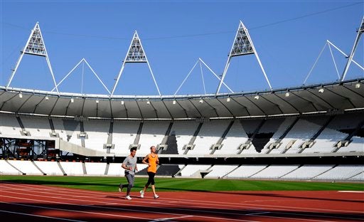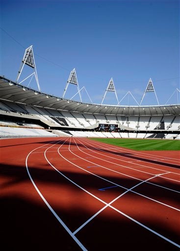 La pista de caucho sintético fue probada este lunes en London 2012 Olympic stadium. FOTO: AP