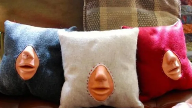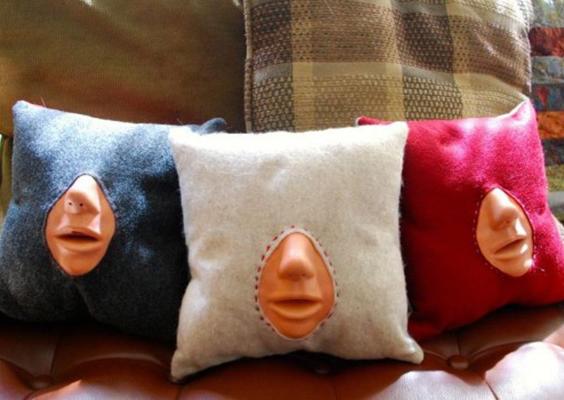 Es una almohada con un labios plásticos cosidos en uno de sus frentes y con la que ahora podrás darte unos buenos besos.