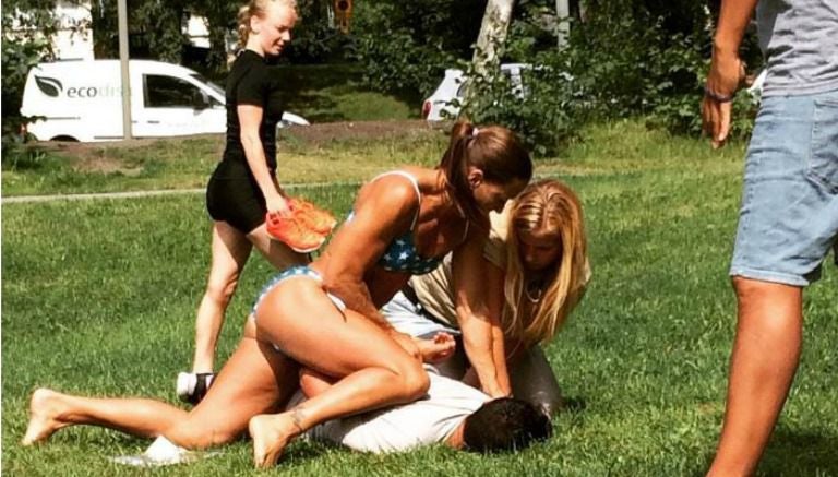 Una imagen en la que se aprecia a una mujer en bikini sometiendo a un ladrón en un parque de Rálambshov, en Estocolmo, se volvió viral en las redes sociales no sólo por el espectacular cuerpo de la fémina, si no también porque ésta resulto ser policía.
