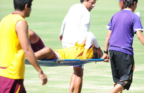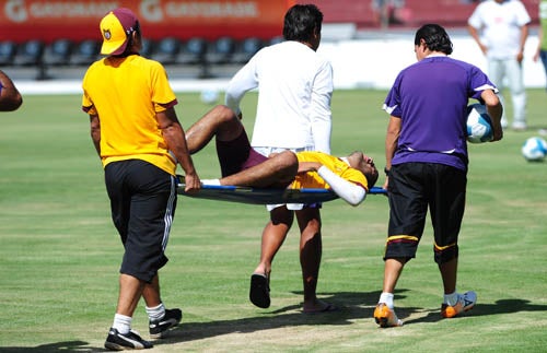 El joven fue sacado de la cancha en camilla debido al intenso dolor (FOTO: EVA BECERRA)
