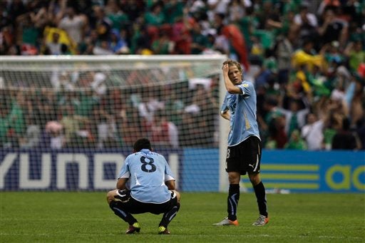 Elbio Alvarez y Sebastian Canobra de la selección uruguaya se lamentan al caer ante México 0-2. FOTO: AP