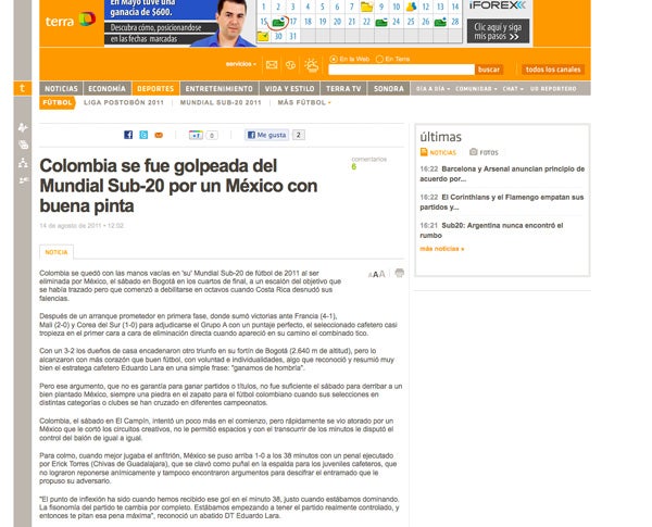 Terra de Colombia señala como 'golpe' la derrota de Colombia y destaca la actuación de México en la cancha