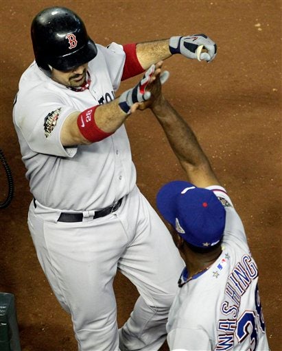 Adrian Gonzalez de los Medias Rojas de Boston celebra su jonrón. FOTO: AP