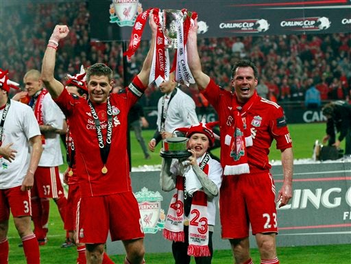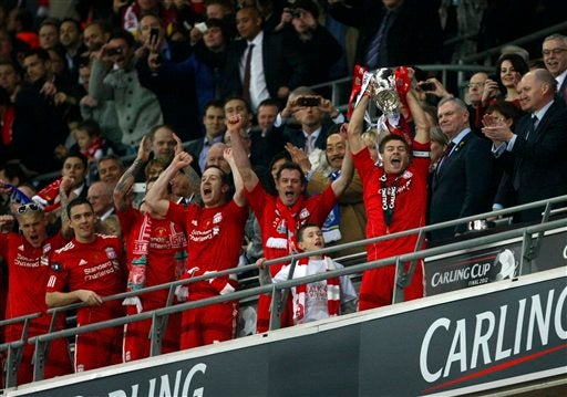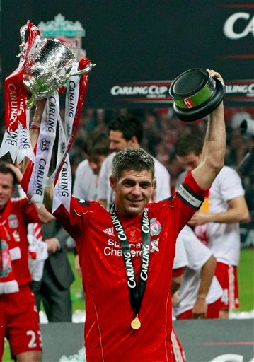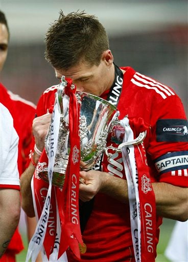 El capitán Steven Gerrard celebta con la Carling Cup. FOTO: AP