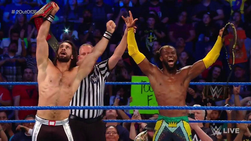 Los campeones de la WWE, Kofi Kingston y Seth Rollins, hicieron equipo para enfrentar a Kevin Owens y Sami Zayn en una lucha tipo de dos a tres caídas, misma que terminaron ganando los monarcas.