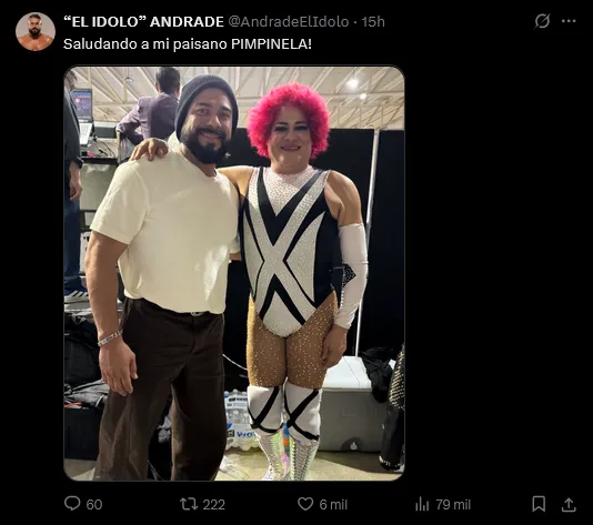 Fue el propio Andrade quien, a través de su cuenta de X (anteriormente Twitter), publicó la imagen donde se le ve sonriente junto a Pimpinela. El luchador originario de Gómez Palacio, Durango, acompañó la foto con un cariñoso mensaje: "Saludando a mi paisano PIMPINELA!"