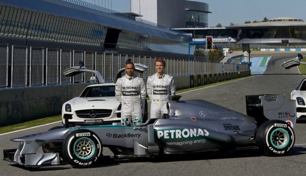 ??A la presentación, desarrollada en la recta de meta del trazado jerezano, Hamilton y el alemán Nico Rosberg, que es el otro piloto de la escudería, llegaron en sendos vehículos Mercedes tipo coupé de color blanco.??