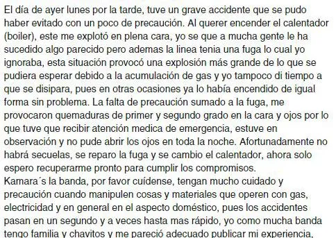 "Al querer encender el calentador (boiler), este me explotó en plena cara, yo sé que a mucha gente le ha sucedido algo parecido pero ademas la linea tenia una fuga lo cual yo ignoraba", redactó Heavy Metal en redes sociales.