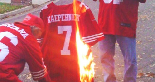 Aficionados de los 49ers de San Francisco quemaron en forma de protesta los jerseys del quarterback del equipo, Colin Kaepernick.