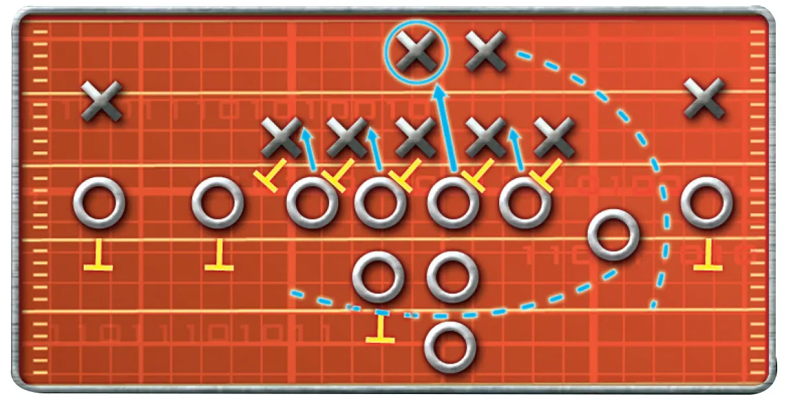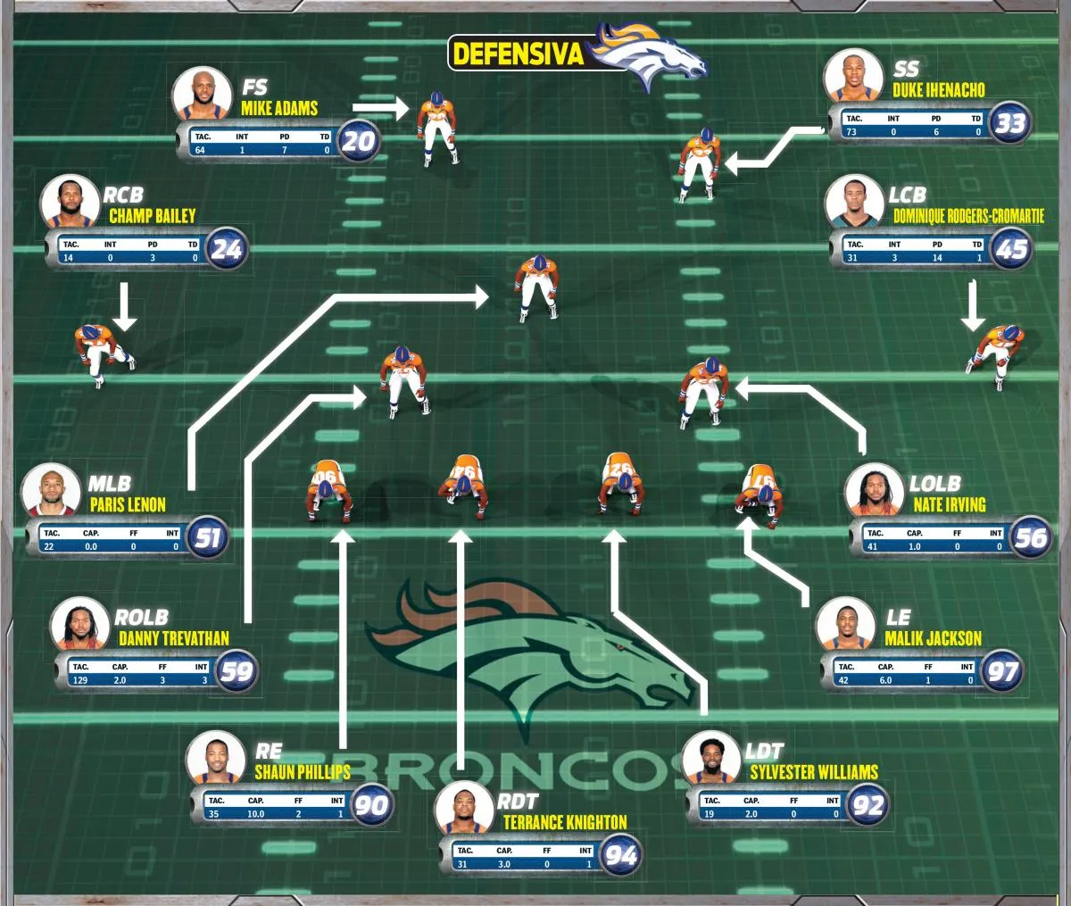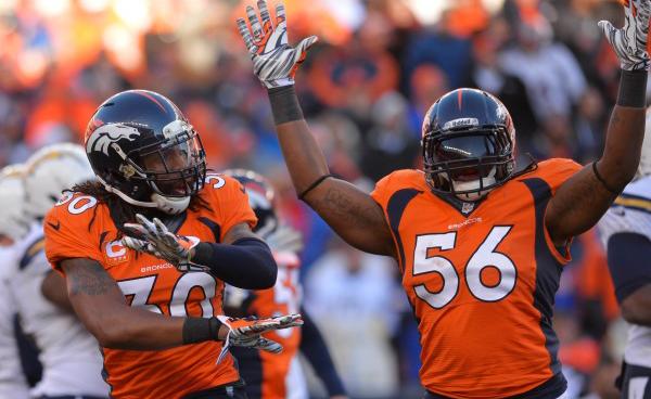Mike Adams, safety libre, se va con el receptor en movimiento, mientras que Danny Trevathan, linebacker, se mantiene frente al centro como si fuera a 'disparar'. Instantes previos a centrar el balón, Trevathan va hacia atrás y se quedan sólo los cuatro frontales.