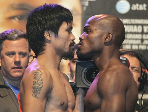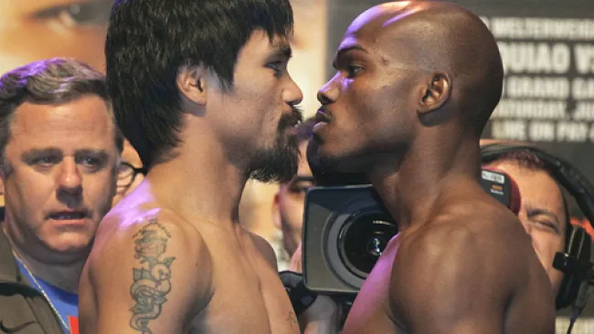 El filipino Manny Pacquiao y el estadounidense Timothy Bradley cumplieron con la báscula, en la ceremonia de pesaje realizada este viernes en la Arena Garden del hotel casino MGM Grand de esta ciudad.