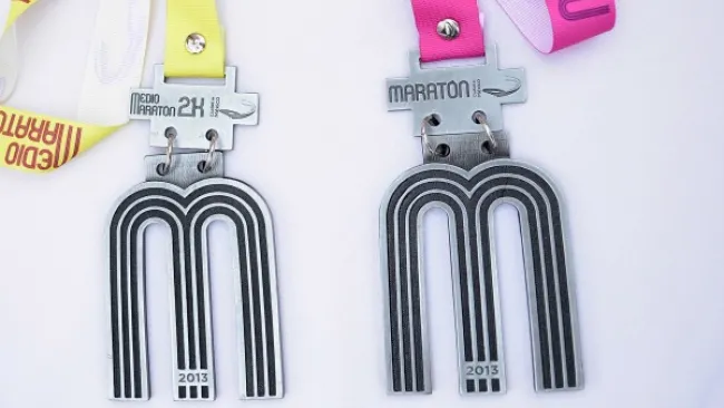 La medalla tiene la forma de la letra M, la cual cambiará el próximo año por la letra E, para que en el Mararatón del 2018 se haya formado la palabra ';México';, como parte de los festejos de los 50 años de los Juegos Olímpicos de México 68.