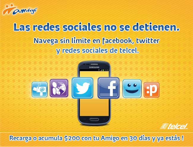 Nosotros te proponemos el mejor fichaje para tu celular: haz una recarga de $200 o acumúlalos en 30 días y consigue navegación ilimitada en Facebook, Twitter, Correo Telcel, Messenger Telcel, Plugger y Portal Móvil Telcel.