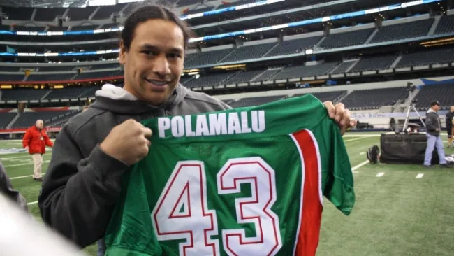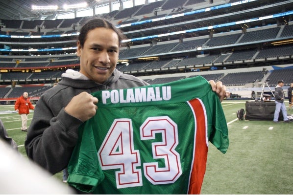 Troy Polamalu, safety estelar de los Steelers, está consciente de la gran afición mexicana con la que cuenta el equipo, por lo que accedió amable en el Media Day a posar con un jersey de México que tenía su nombre y número.