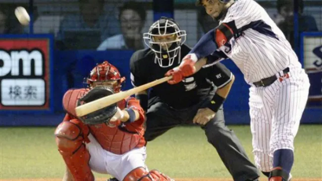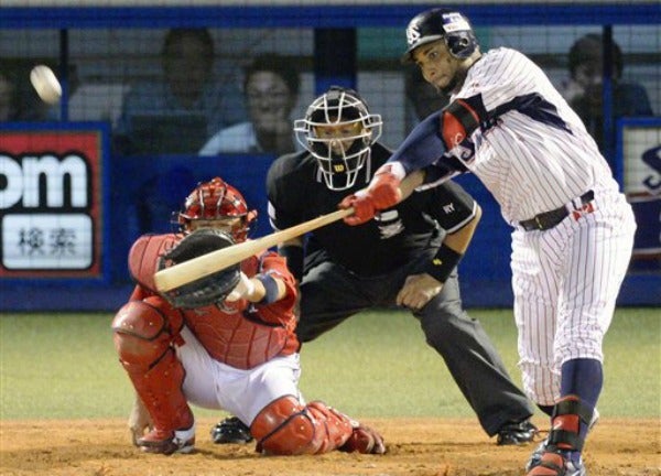 El pelotero pegó un jonrón en la sexta entrada en el estadio Jingu y recibió un ramo de flores. Pese a su jonrón, su equipo Yakult Swallows perdió el partido del miércoles 6-2 frente a Hiroshima Carp.