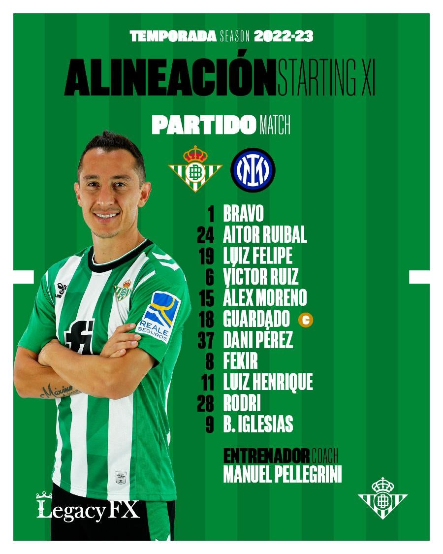 El cuadro verdiblanco recibió al Inter de Milan en su partido de pretemporada en el Estadio Benito Villamarín en donde Guardado fue titular y capitán, sumó un total de 66 minutos.