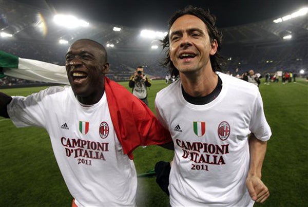 Inzaghi y Seedorf portando la playera conmemorativa (FOTO: AP)