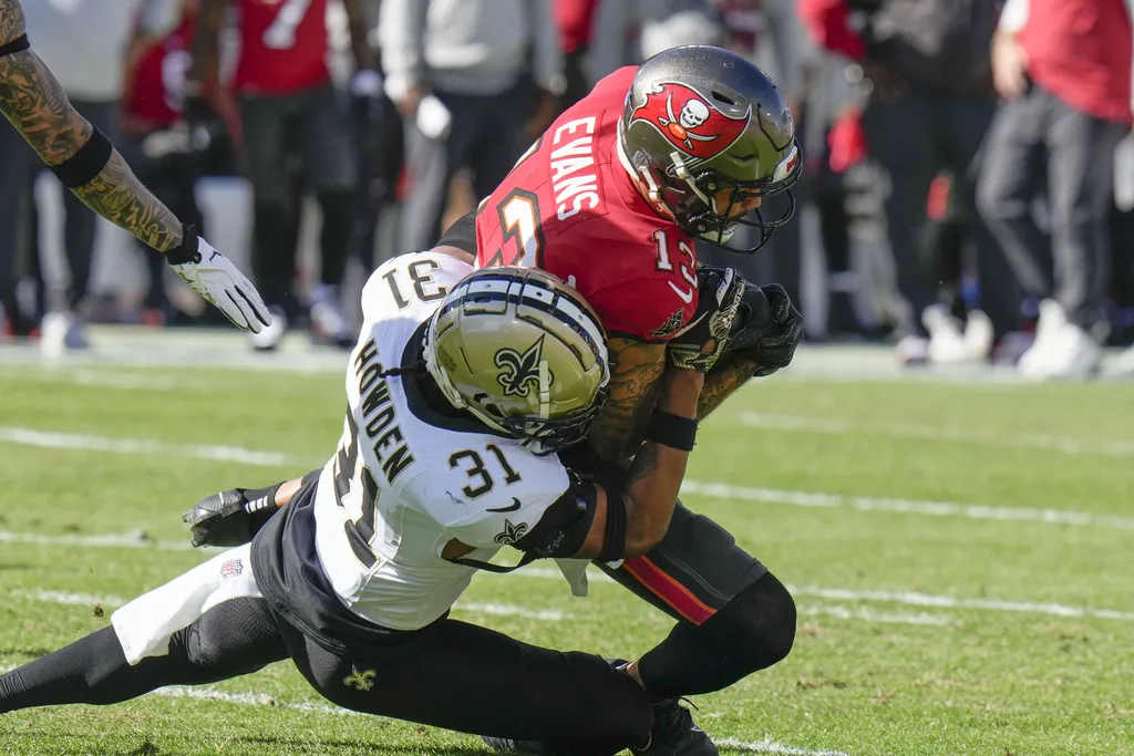 Evans alcanzó la marca con una recepción de 9 yardas de Baker Mayfield en la última jugada de la victoria de los Buccaneers por 27-19 sobre los New Orleans Saints, que les aseguró el pase a los playoffs. El receptor de 31 años terminó con nueve recepciones para 89 yardas, elevando su total de la temporada a 74 recepciones para 1,004 yardas.