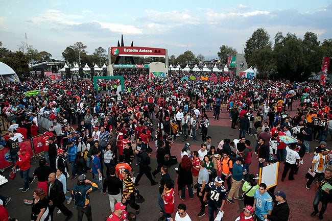 En la periferia del Estadio Azteca abundaron los productos pirata alusivos al partido de la NFL en México entre Kansas City Chiefs y Los Angeles Chargers.