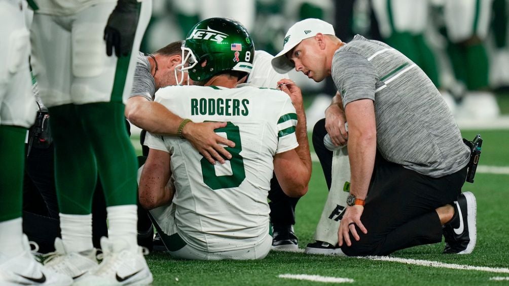 Aaron Rodgers salió lesionado en la cuarta jugada ofensiva en su debut como miembro de los Jets de Nueva York y requirió ser asistido con una aparente lesión en el tobillo el lunes por la noche.