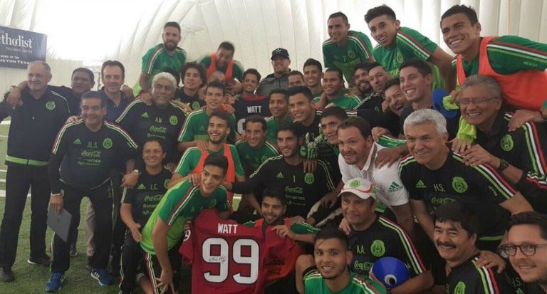 El jugador de los Texanos de Houston, JJ Watt, visitó a la Selección Mexicana durante el entrenamiento de este día en la cancha 2 del estadio NRG.
