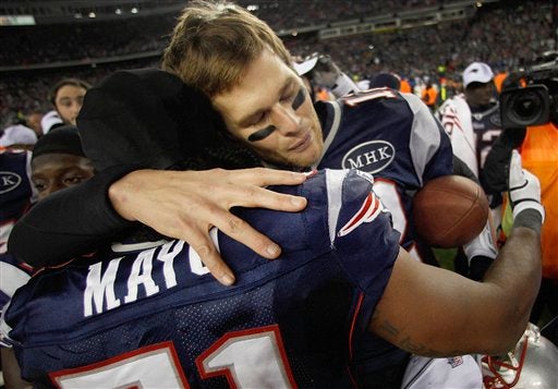 Tom Brady abraza a Jerod Mayo, luego de obtener el Campeonato. FOTO: AP