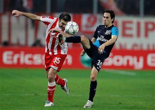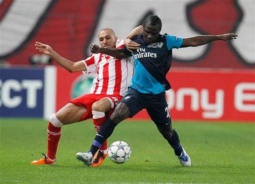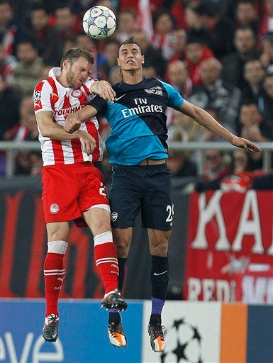 Vassilis Torosisdis del Olympiacos pelea por el esférico. FOTO: AP