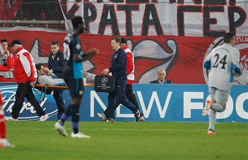 Vito Mannone sale en camilla mientras Lukasz Fabianski toma su lugar en portería. FOTO: AP